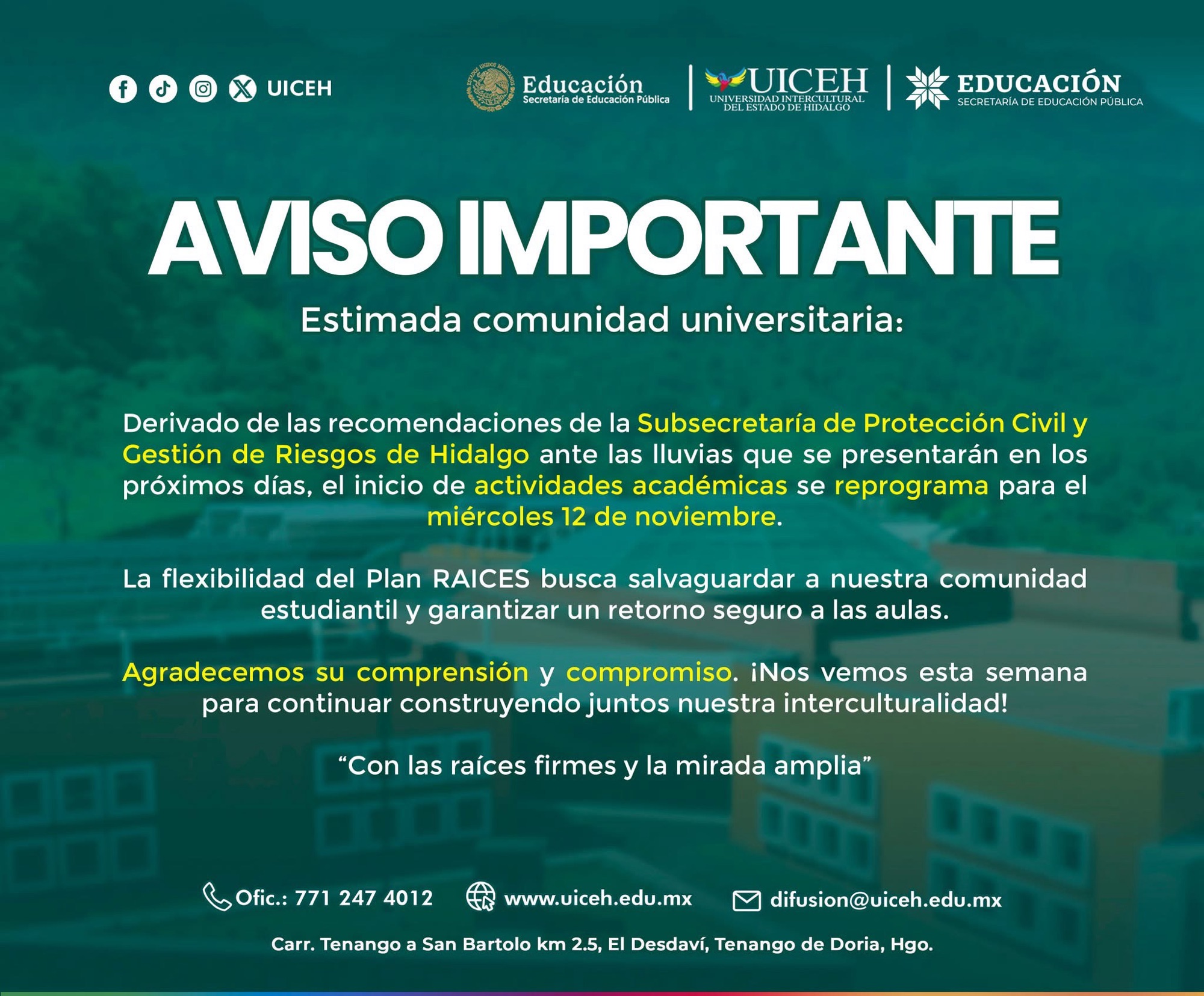 Tenango de Doria, Hgo.— La Universidad Intercultural del Estado de Hidalgo (UICEH) anunció la reprogramación del inicio de actividades académicas para el miércoles 12 de noviembre, luego de que la Subsecretaría de Protección Civil y Gestión de Riesgos emitiera nuevas recomendaciones ante el pronóstico de lluvias fuertes en la región durante los próximos días.