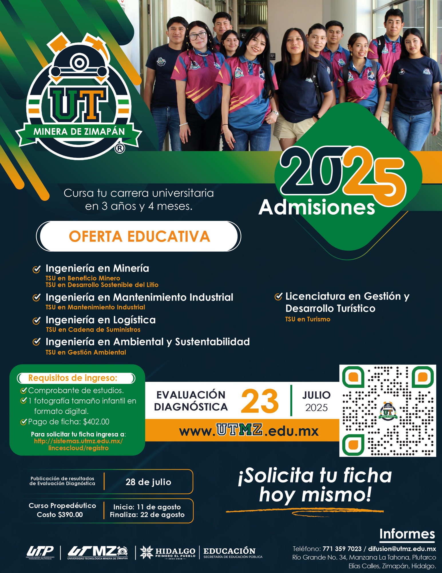 La Universidad Tecnológica Minera de Zimapán (UTMZ) mantiene abierta su convocatoria de admisiones 2025, dirigida a estudiantes que están por concluir su bachillerato y a personas que desean continuar su formación profesional en una institución que ofrece una educación tecnológica de calidad, centrada en la práctica, la innovación y la vinculación directa con el sector productivo.