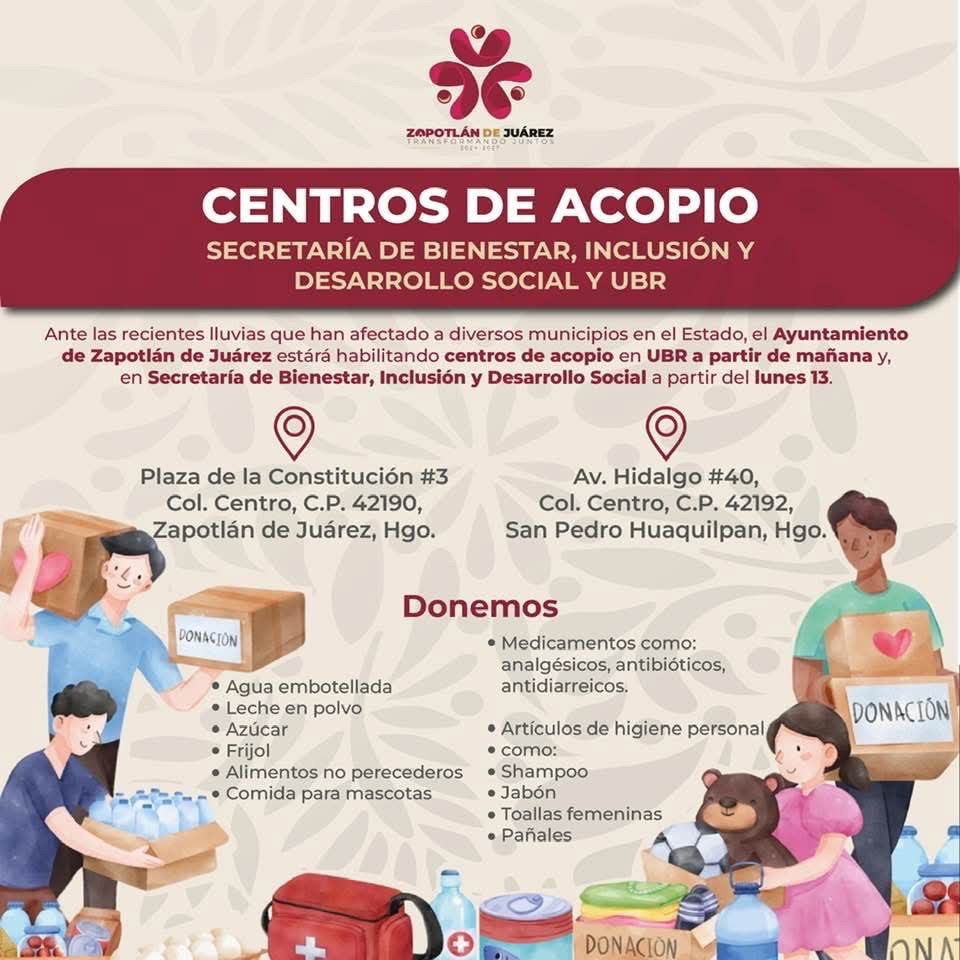 Zapotlán de Juárez, Hgo., 12 de octubre de 2025.– Como parte de las acciones de apoyo derivadas de la emergencia provocada por las intensas lluvias en diferentes regiones del estado, el Gobierno Municipal de Zapotlán de Juárez informó que las delegaciones de San Pedro Huaquilpan y Acayuca, así como la Unidad Básica de Rehabilitación (UBR), operan como centros de acopio para recibir donativos en especie destinados a las zonas afectadas.